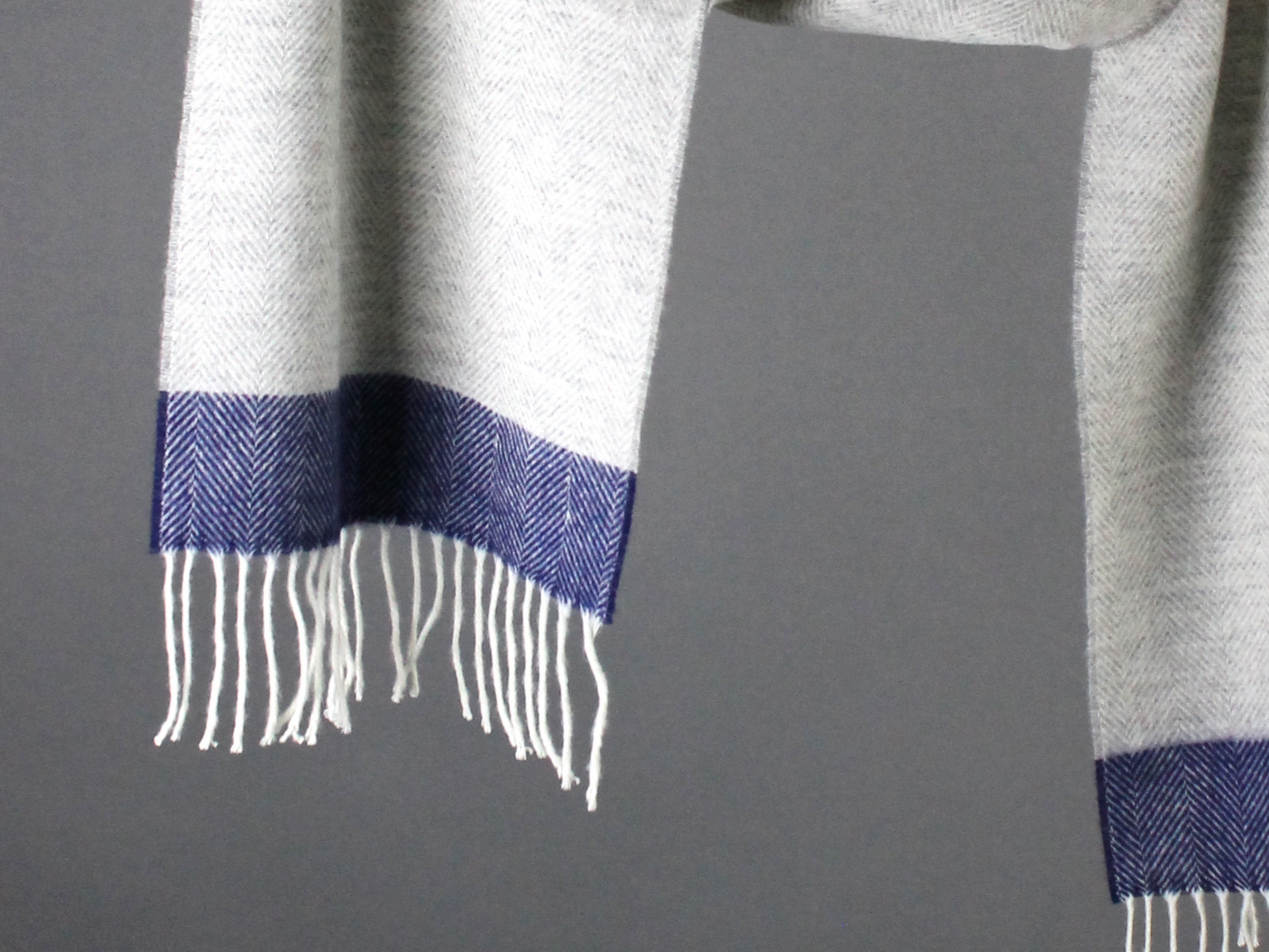 Wrap yourself in timeless elegance with this lambswool herringbone scarf, distinguished by its sophisticated grey hue accented with navy stripes at each end.